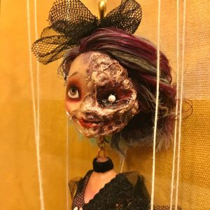 DESCRIPTION: My Hel is a tiny marionette. As she hangs effortlessly on her strings, she appears weightless and elegant; polite, but a bit of a tease. The half of her face that is alive is innocent and radiant, like that of a gullible child. The side that is dead is void of all expression of life, but it is neither evil nor scary, it is simply dead. Death is a part of every life, and Hel wears that side of her without hesitation or embarrassment. She knows that were are all already dead and she does not judge us for it.